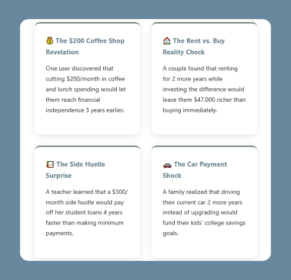 One user discovered that cutting $200/month in coffee and lunch spending would let them reach financial independence 3 years earlier.