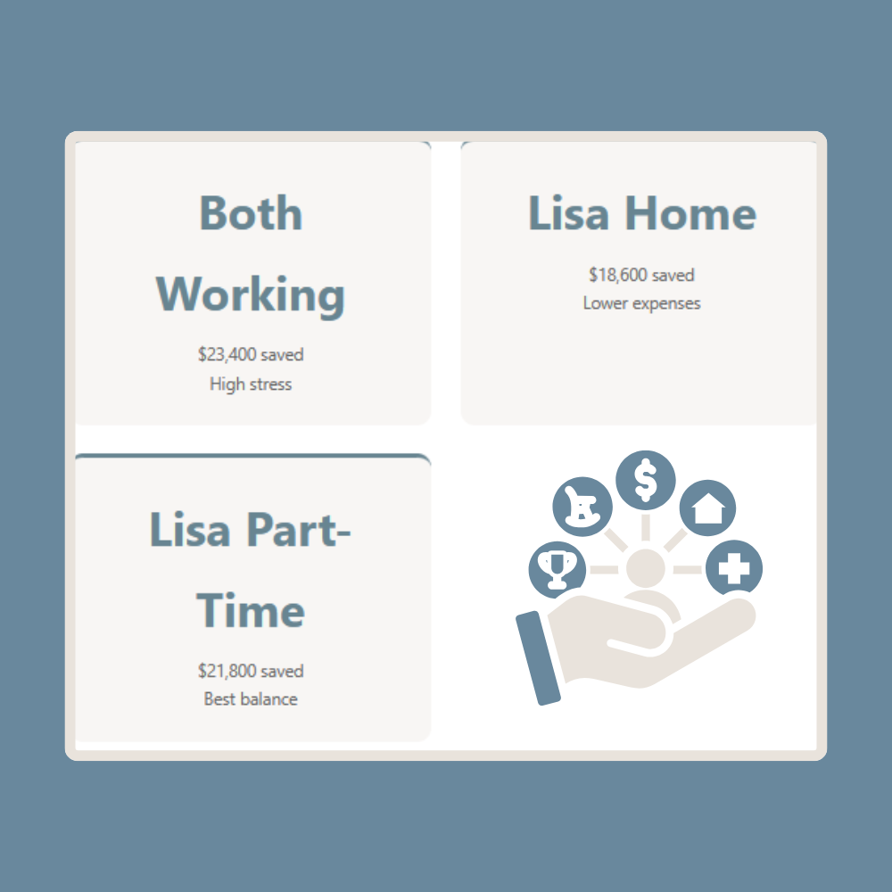 The result? They discovered that Lisa working part-time from home gave them 93% of the financial benefit of both parents working full-time, while eliminating childcare costs and reducing stress. They wouldn’t have seen this without running the scenarios!