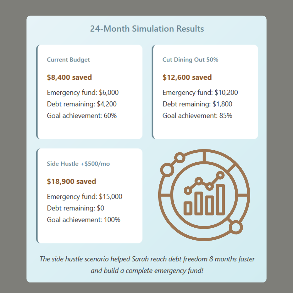 Create multiple scenarios (current budget vs. reduced spending vs. income increase) and see which path leads to better outcomes.